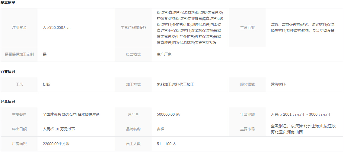 唐山市吉祥保溫工貿有限公司坐落于唐山市路南區,是一家獨資經營的專業化技術公司,經營范圍:預制直埋管直管,高密度低壓聚乙烯(HDPE)塑料保溫外護管材,熱熔接頭套管,單體整體塑料支架,是國內大型集中供熱客戶的理想合作伙伴。